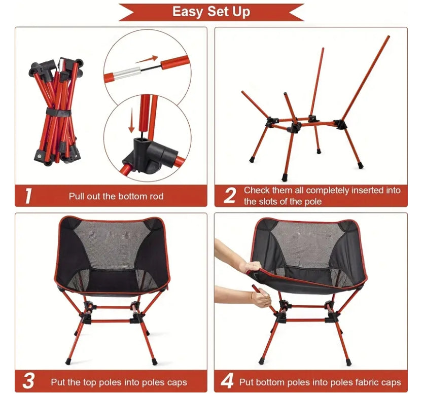 Easy to install and clean : Well structured four legs and foldable mesh, make it easy to set up and fold down, within one minute you can finish the assembly process.This portable chair is compact enough to put into your backpack or your carry-on luggage. The camping chair is also very easy to clean, you only need to clean with soap and water