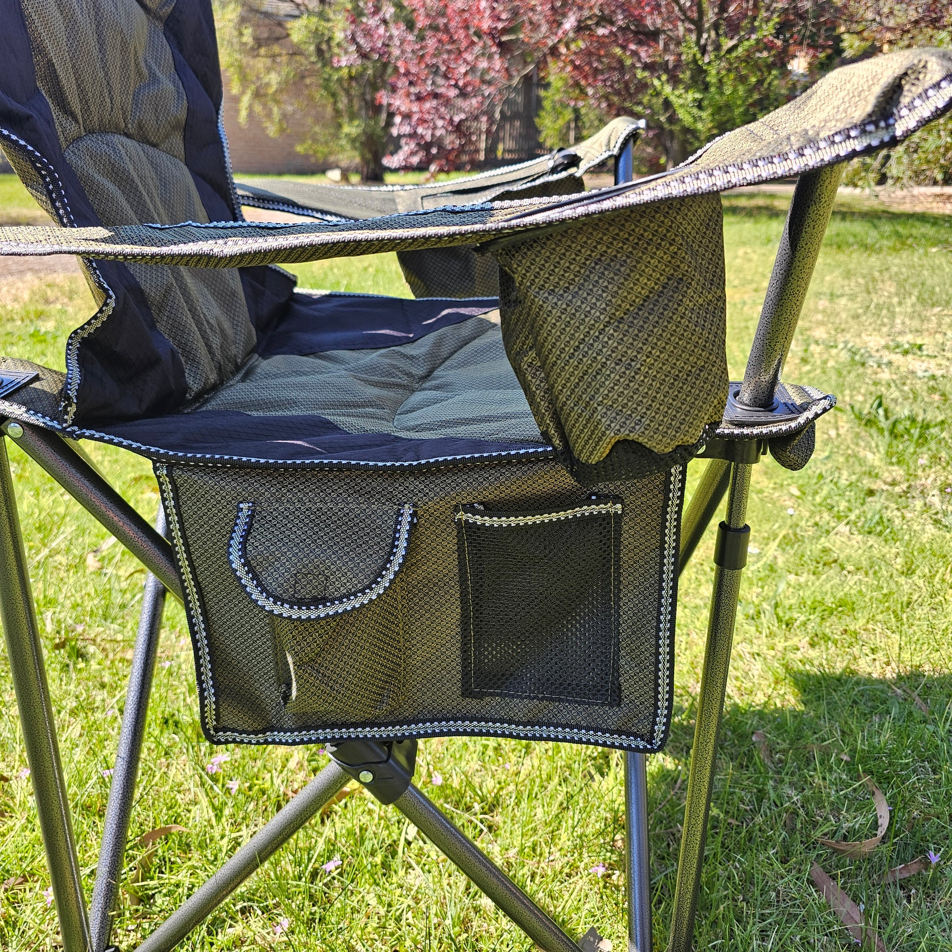 - **Portable and Foldable**: Easily foldable for quick setup and takedown, this chair is ideal for camping, picnics, or any outdoor event. It comes with a sturdy black carrying bag for effortless transport and storage.